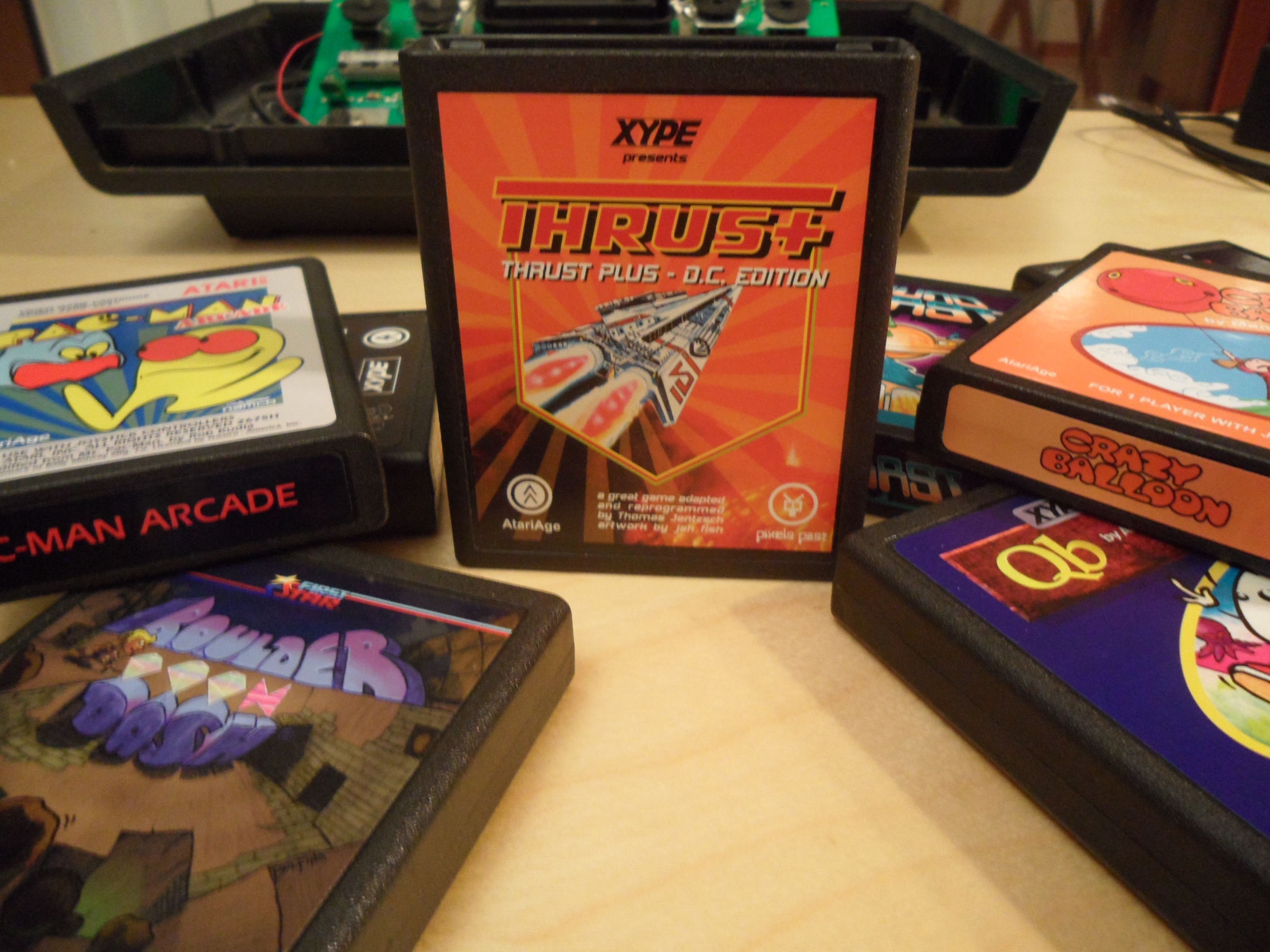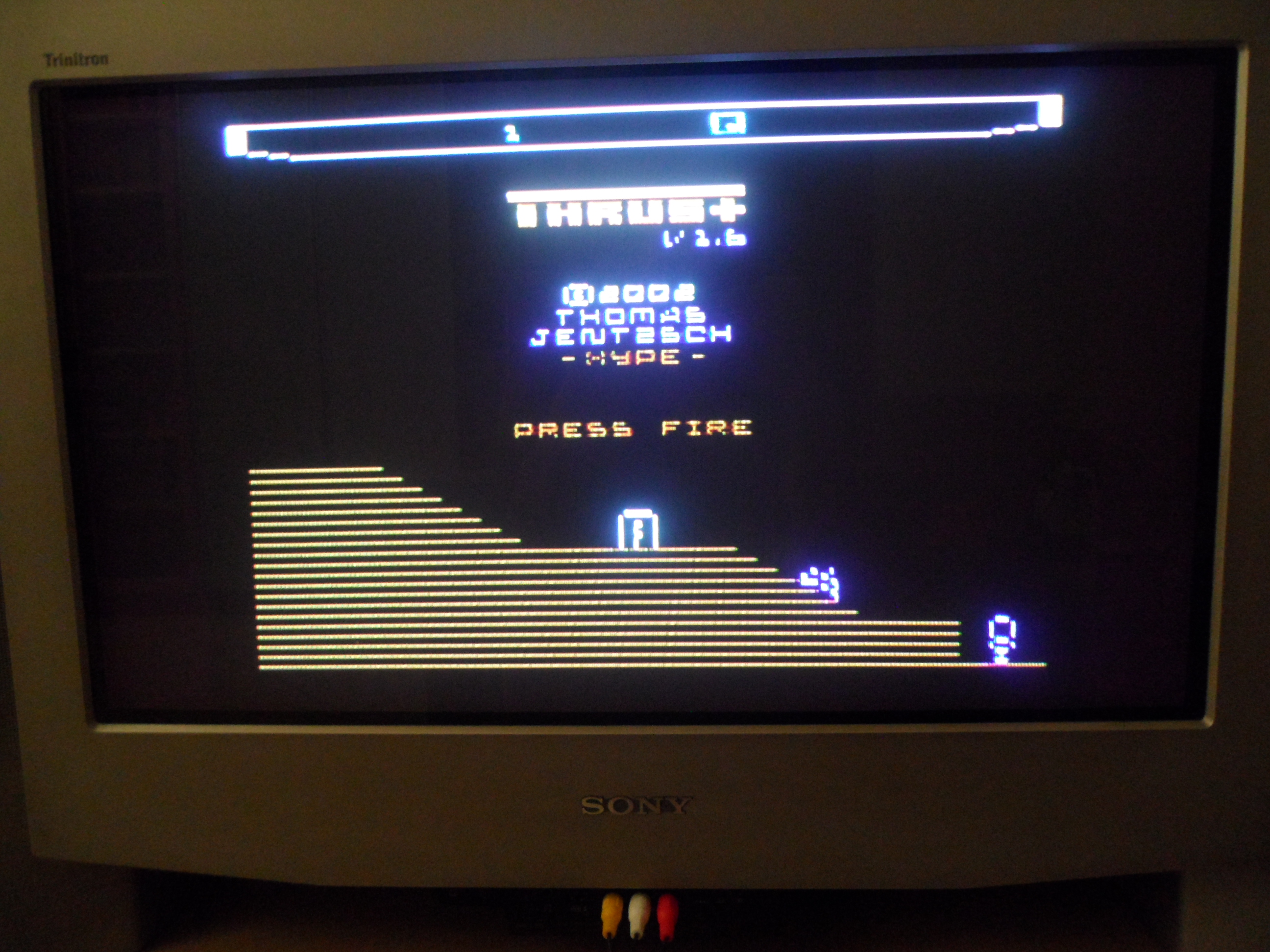 Esistono tre versioni, pubblicate in periodi diversi, e dovuti all’evoluzione del gioco: la prima è semplicemente intitolata THRUST , pubblicata nel 2000, la seconda invece nominata THRUST PLUS – D.C. EDITION, e pubblicata nel 2002 (quella che io possiedo). La seconda si differenzia dalla prima per la possibilità di poter collegare dei comandi aggiunti come la pedaliera abbinata al driving controll o joystick, ma vi garantisco che così potrebbe venirvi un crampo al piede, per le continue spinte necessarie alla stabilizzazione dell’astronave. Infine, la terza ed ultima versione, THRUST PLUS – PLATINUM EDITION, pubblicata nel 2004, che implementa la musica di RON HUBBARD scritta per COMMODORE 64 e trasportata per l’ ATARI 2600 da PAUL SLOCUM.